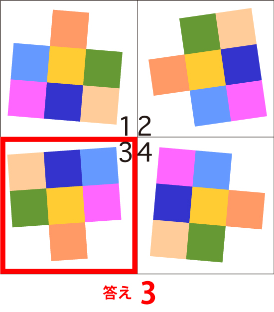 違い探し 図形4つの中で、1つだけ他の3枚と違う図形があります。その番号を答えなさい。 |