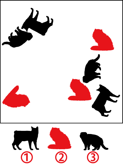 下の枠の中に猫のイラストがあります。3種類の猫(ペルシアン・ジャパニーズボブテイル・スコティッシュフォールド)の中で1種類だけ数が多いのは何番?