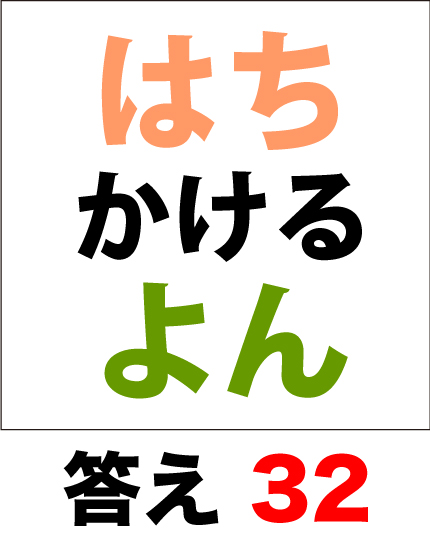 ひらがな掛算問題。(はちかけるよん)はいくつ?暗算で計算してみましょう。制限時間、採点機能もないので自分のペースで認知症予防にご利用下さい。