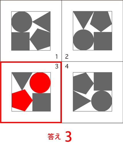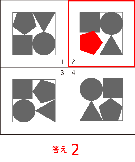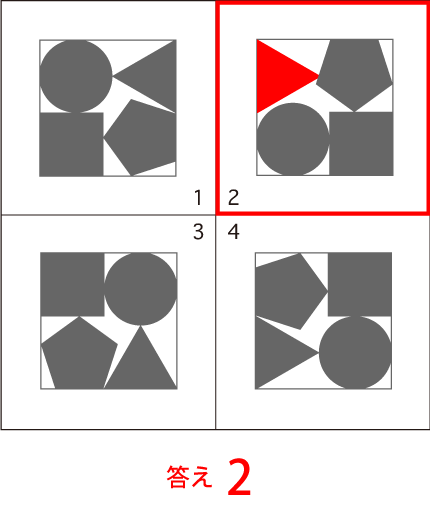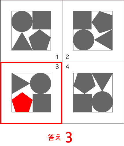 違い探し 図形4つの中で、1つだけ他の3枚と違う図形があります。その番号を答えなさい。 |