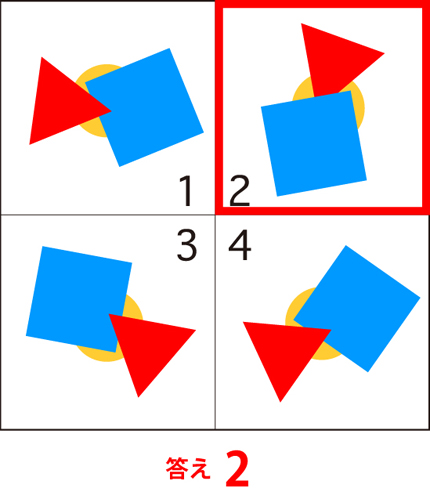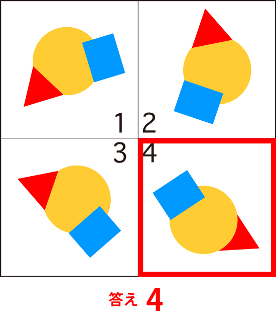 違い探し 図形4つの中で、1つだけ他の3枚と違う図形があります。その番号を答えなさい。 |