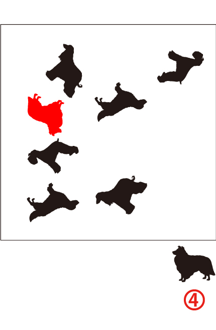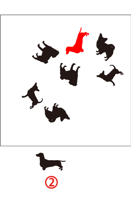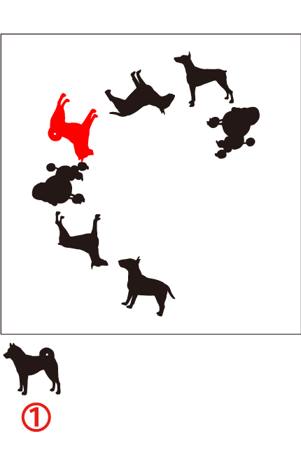 下の枠の中に犬のイラストが7枚あります。4種類の犬の中で1匹しかいない番号を答えなさい。