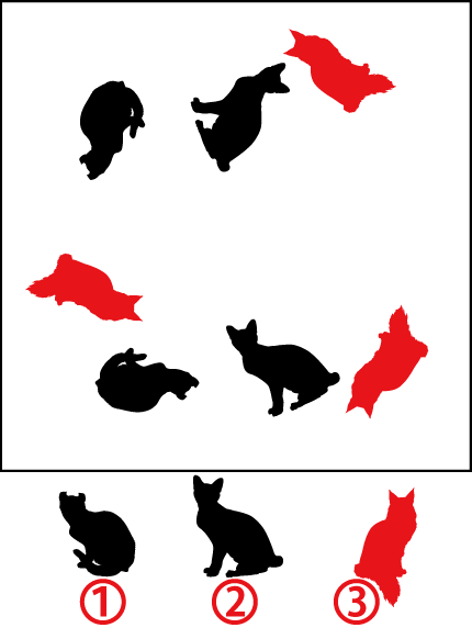 下の枠の中に猫のイラストがあります。3種類の猫(シャム猫・アメリカンショートヘア・日本猫)の中で1種類だけ数が多いのは何番?