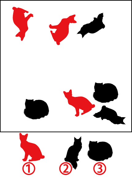 下の枠の中に猫のイラストがあります。3種類の猫(日本猫・メインクーン・ペルシャ猫)の中で1種類だけ数が多いのは何番?
