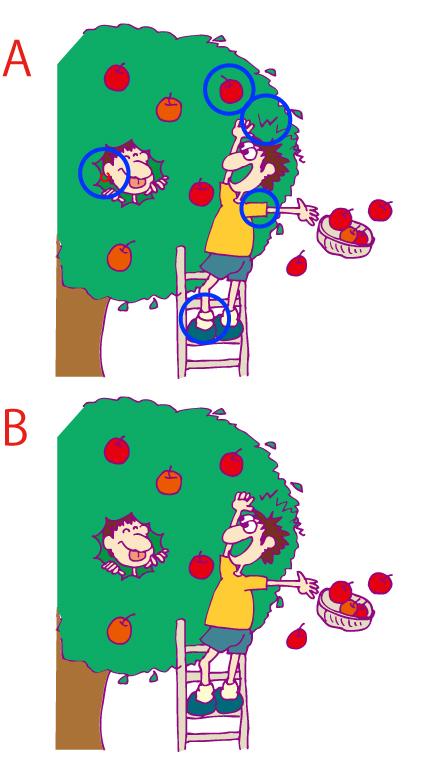 リンゴ狩り?のイラストで間違い探し。(※リンゴの樹は、下のイラストのようなイメージではありませんね)AとBのイラストを比較して、5カ所の間違いを見つけてください。