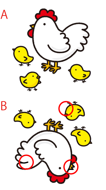 鶏と3匹のひよこのイラストを使った間違い探し問題です。個人で使用する場合、営利目的でなければプリントは無料です。AとBのイラストの違いを3箇所答えなさい。