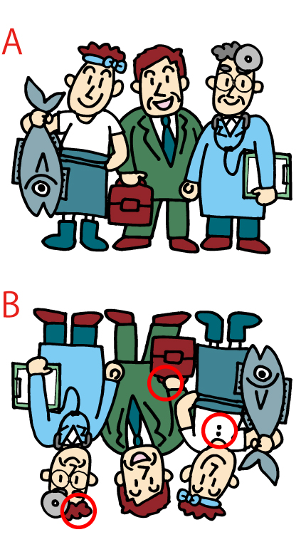 AとBのイラストの違い3カ所を探してみてください。個人で使用する場合、営利目的でなければプリントは無料です。魚屋、サラリーマン、医者のイラストで間違い探しです。時間制限はないので自分のペースでトレーニングにご使用下さい。