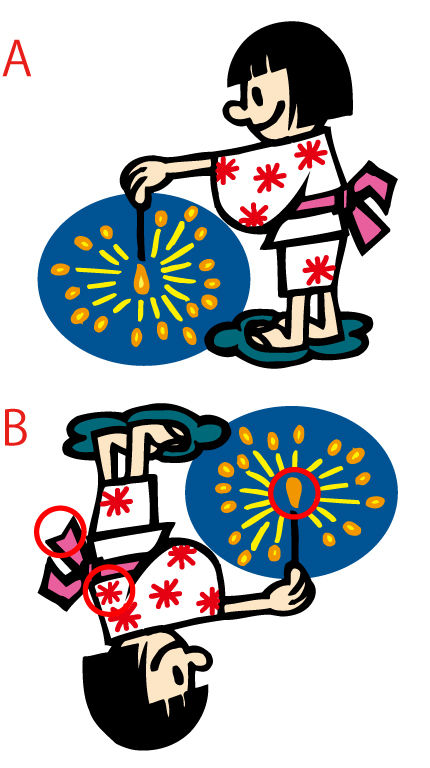 イラストで間違い探しです。浴衣の少女が花火をしています。AのイラストとBのイラストを比較して、3カ所の違いを探してみてください。