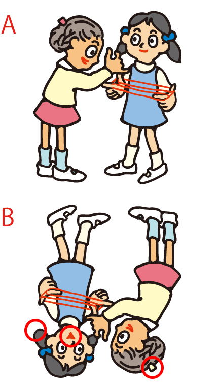 イラストを使って間違い探しをします。2人の女の子が、あやとりをして遊んでいます。AのイラストとBのイラストをよく見比べて、違いを3カ所見つけてください。営利目的でなければプリントして使用可能です。