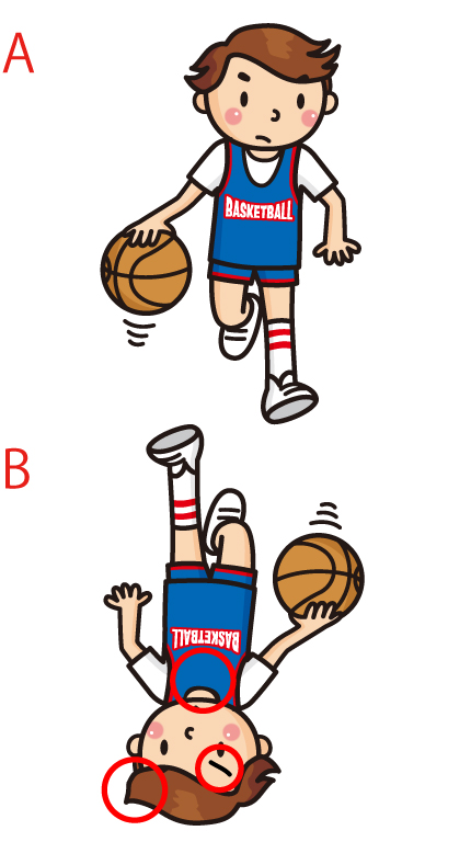 少年がバスケットボールでドリブルをしています。このイラストを使って間違い探しです。AとBのイラスト違いを3箇所見つけて下さい。