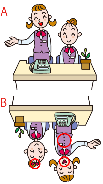 受付嬢が笑顔でお迎えです。このイラストを使って間違い探し問題です。AとBのイラストの違いを3箇所答えなさい。