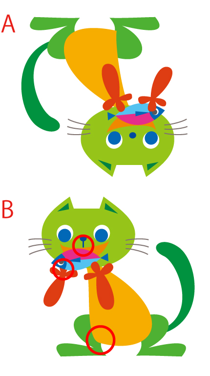 間違い探し間違い探しの問題は、Bのイラストが回転します。AとBのイラストの違いを見つけてください。 |