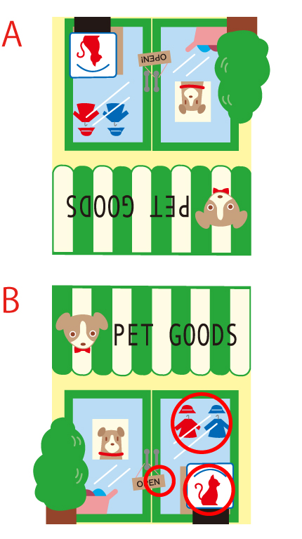 ペット雑貨店の店頭イラストを使って間違い探しです。AとBのイラストを比較して、3カ所の違いをみつけてください。時間制限はないので自分のペースでトレーニングにご使用下さい。個人で使用する場合、営利目的でなければイラストのプリントは無料です。