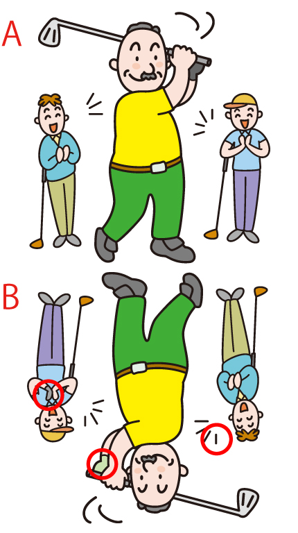 接待ゴルフでしょうか?若い2人の盛り上げで商談もうまくまとまれば良いですね。このイラストを使って間違い探しをします。AとBのイラストをよく見比べて、違いを3カ所見つけてください。この間違い探しの問題は、営利目的でなければプリントして使用可能です。