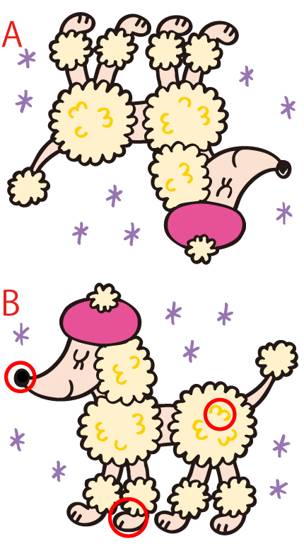 リリーちゃんは、いつもオシャレにしています。このイラストを使って間違い探しです。AのイラストとBのイラスト違いを3箇所見つけて下さい。