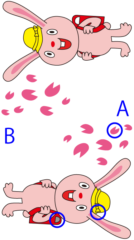 うさぎキャラの新小学生?でしょうか。このイラストを使って間違い探し問題です。AとBのイラストの違いを3箇所答えなさい。