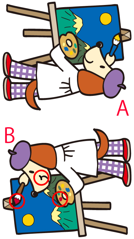 間違い探し間違い探しの問題は、Bのイラストが回転します。AとBのイラストの違いを見つけてください。 |