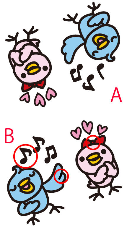 鳥の求愛でしょうか?雄鶏が雌鳥に歌を歌っています。このイラストを使って間違い探しです。AとBのイラストを比較して、3カ所の違いをみつけてください。