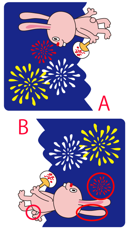 あやしいウサギが花火を見ています。このイラストを使って間違い探しをします。AとBのイラストをよく見比べて、違いを3カ所見つけてください。