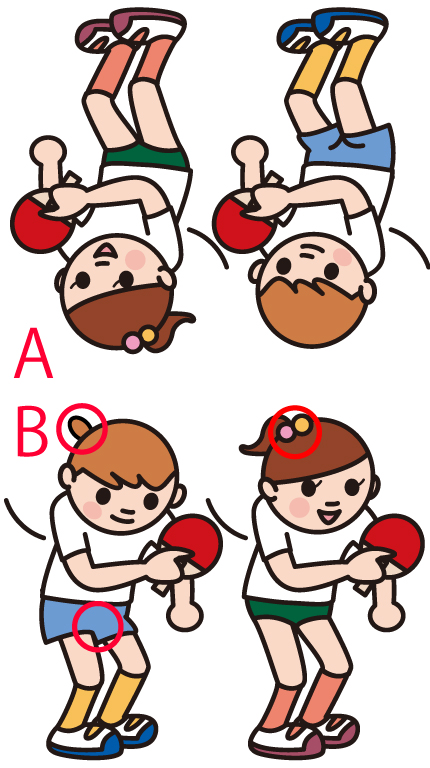 卓球女子が、オリンピックを目指して毎日練習しています。このイラストを使って間違い探しです。AのイラストとBのイラスト違いを3箇所見つけて下さい。