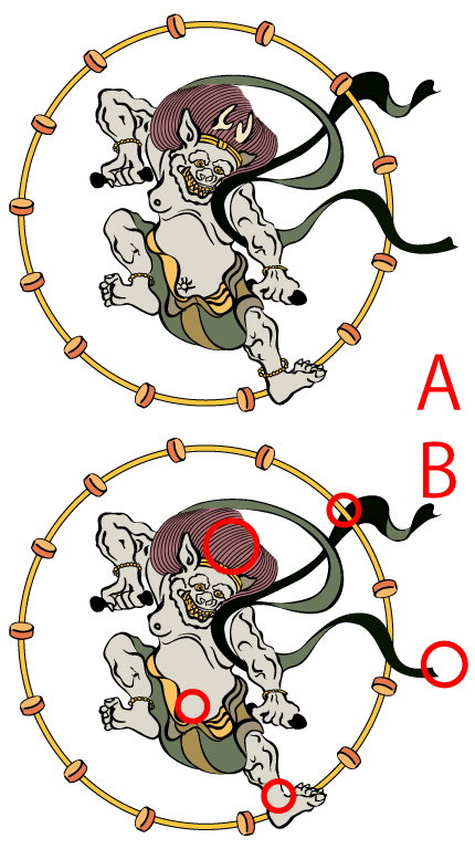 俵屋宗達の描いた雷神図のイラストを使って間違い探し問題です。AとBのイラストの違いを5箇所答えなさい。時間制限はないので自分のペースでトレーニングにご使用下さい。個人で使用する場合、営利目的でなければイラストのプリントは無料です。