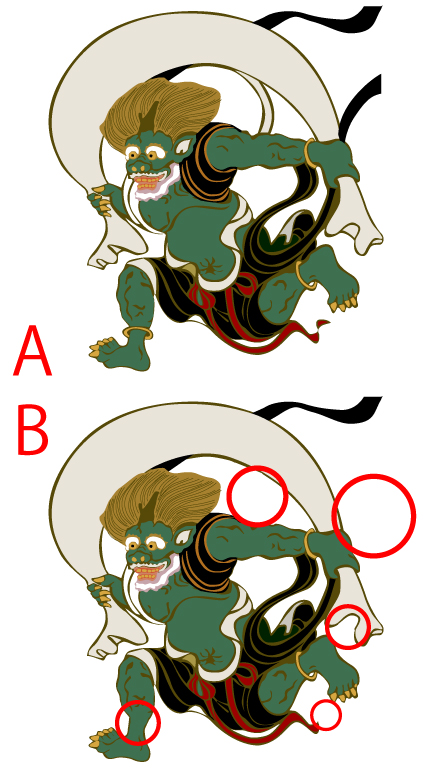 俵屋宗達の描いた風神図。このイラストで間違い探しです。AのイラストとBのイラストの違い5カ所を見つけてください。