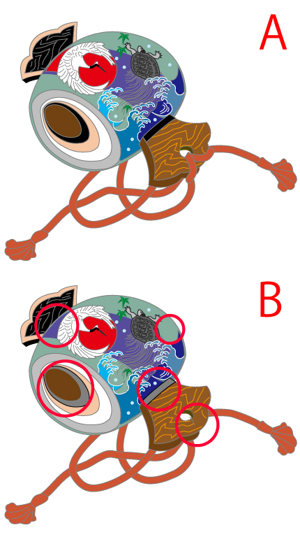 歌舞伎風のイラストを使って間違い探しです。AとBのイラストを比較して、5カ所の違いをみつけてください。