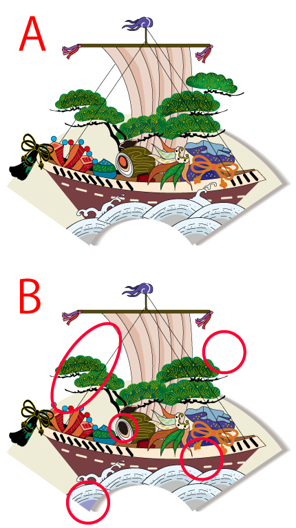宝船のイラストを使って間違い探しです。AのイラストとBのイラスト違いを5箇所見つけて下さい。